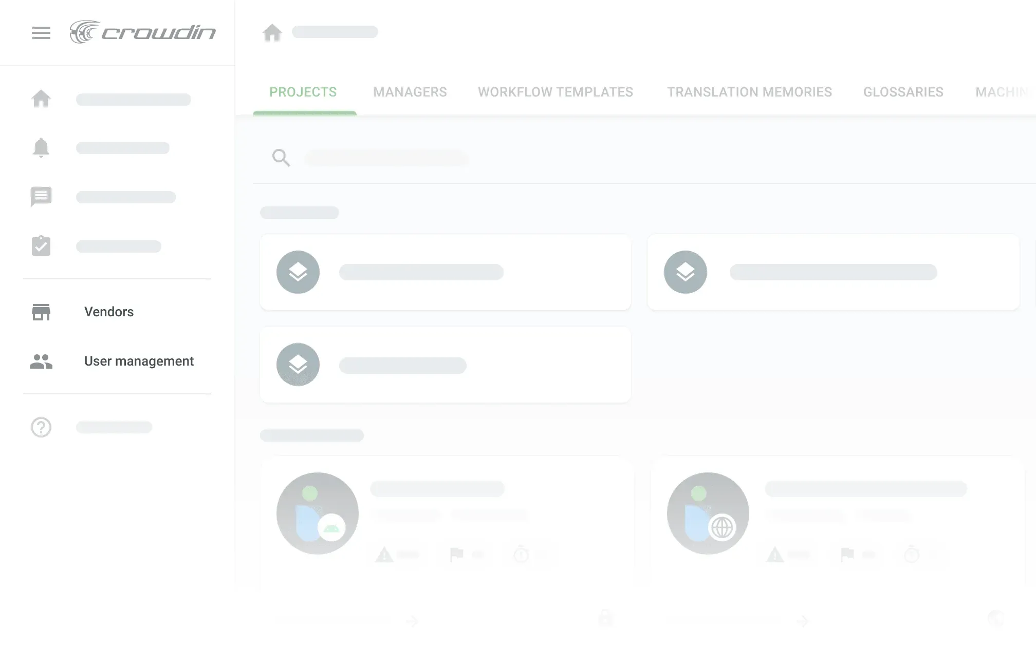 We start with the Workspace, a place where every localization puzzle is brought together. It’s a place where you create and get access to all projects, groups, and localization resources, where you invite vendors, grant accesses, and manage permissions. The UI of the new workspace is designed to give you a clear vision of what’s going on within your organization and quickly access all the things you might want to check, customize, or control.